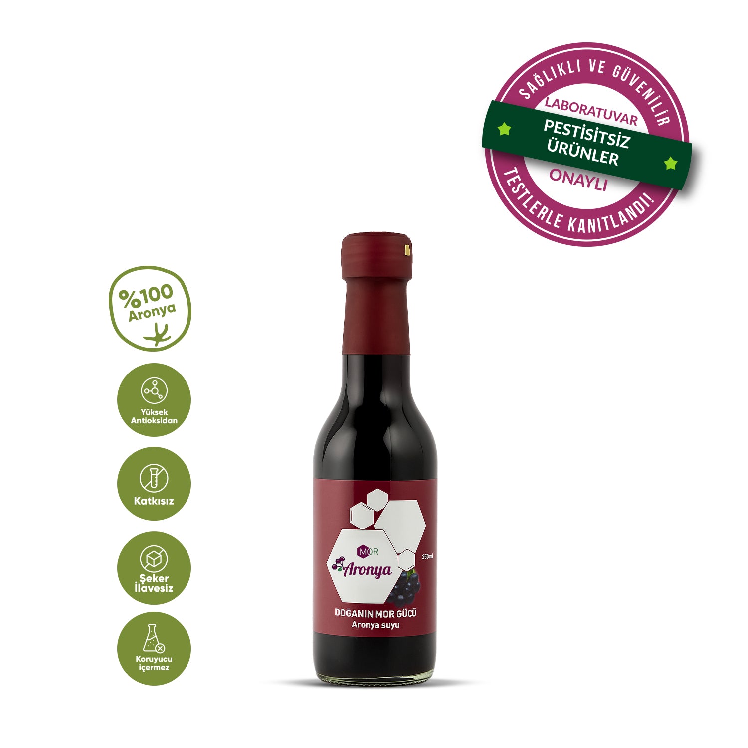 Doğallığın en konsantre hali! Fonksiyonel gıda kategorisinin parlayan yıldızı olan mor aronya, bu şişede tüm doğallığı ve besleyici gücüyle buluşuyor. %100 Aronya meyvesinden elde edilen katkısız içeriği, günlük yaşamınıza sağlık ve denge katarken; eşsiz mor rengi ve güçlü aromasıyla da damakta iz bırakıyor. Türkiye’de Kırklareli tarlalarından mevsiminde toplanan aronya meyveleriyle üretilmiştir